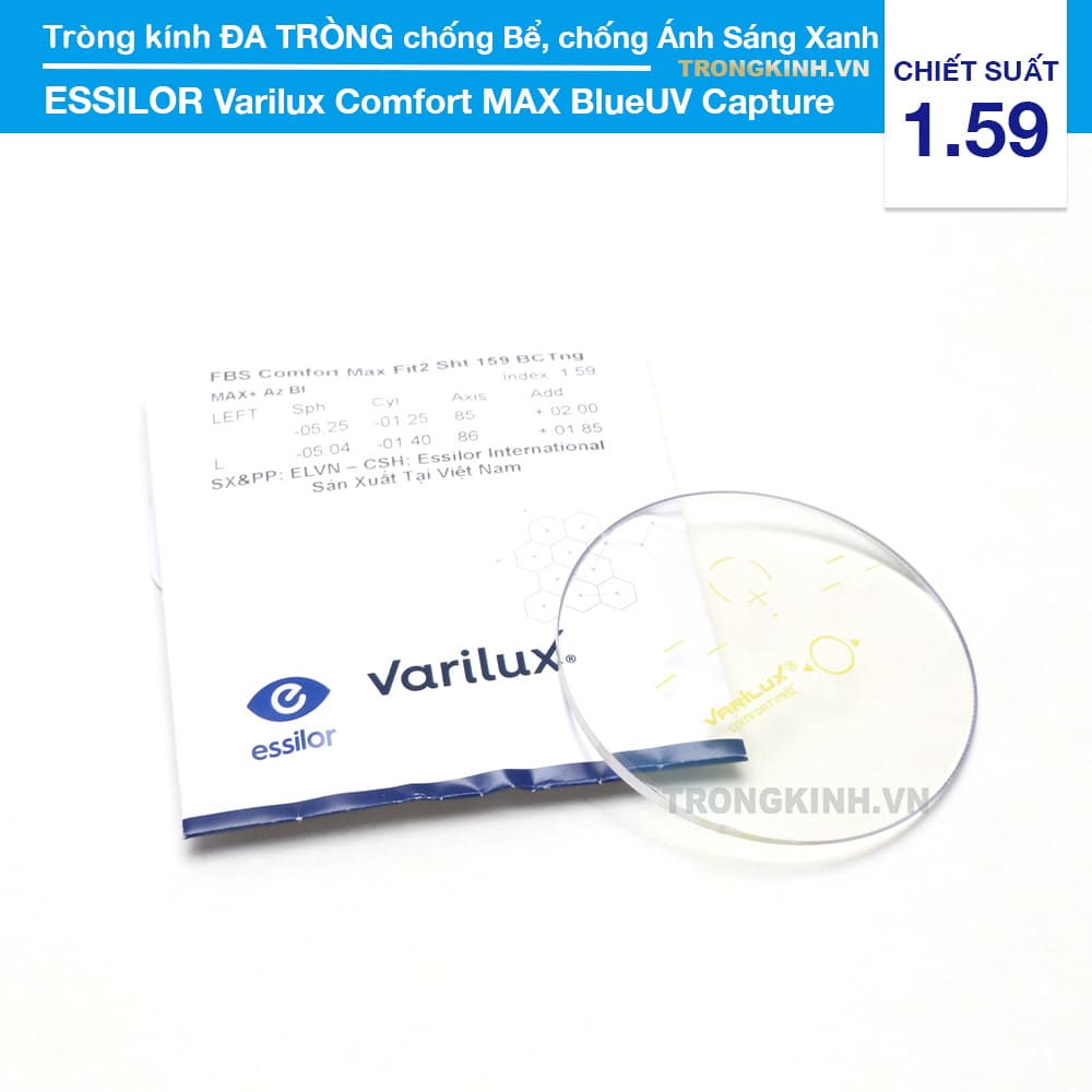 Nếu bạn cần tròng kính đa tròng bền bỉ thì nên chọn tròng kính Essilor Varilux Comfort Max Blue UV Capture 1.59 AS Airwear, một sản phẩm nổi tiếng bán chạy đến từ Pháp
